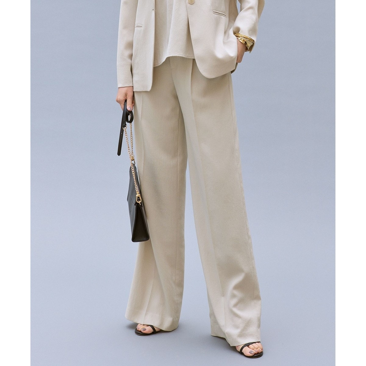 機能性と上品さが揃った通勤にも最適なパンツ ■デザイン1タック入りのワイドストレートパンツです。裾に向かってすとんと落ちるシルエットが、足を長くきれいに見せる視覚効果を生み出します。ウエストは脇から後ろにかけてゴム仕様で、きちんと感を保ちながら快適な履き心地です。同素材のブラウス(BLWMLM0411)やジャケット(JKWMLM0411)と合わせたセットアップスタイルとしてもスッキリとまとまり、おすすめです。■素材梳毛調のストレッチポリエステルをベースに、オリジナルのスラブ糸を使用したツイル素材です。ナチュラルワッシャー加工と減量加工を組み合わせることで、ソフトな風合いと程よい落ち感を引き出しました。きれいな表情を保ちながらも快適な着心地が魅力で、接触冷感・吸水速乾・UVケア・着用時の防シワといった機能性も備えています。■同素材ジャケット(JKWMLM0411)ブラウス(BLWMLM0411)