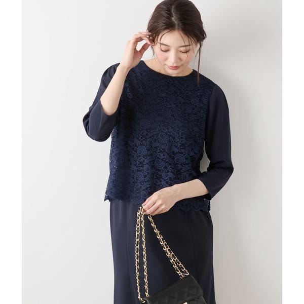 ロングシーズン着回せる、7分袖のクルーネックプルオーバー。レースを重ねた2枚仕立ての身頃は、オーバーでの着用はもちろん内側のみ裾をインして透け感を楽しむのもおすすめ。レース部分の裾はモチーフを活かしたスカラップ状のカッティングで、着こなしにさりげないアクセントを添えてくれます。袖はジャケットインにも使いやすいプレーンな1枚仕立てで、すっきりとした印象に仕上げました。