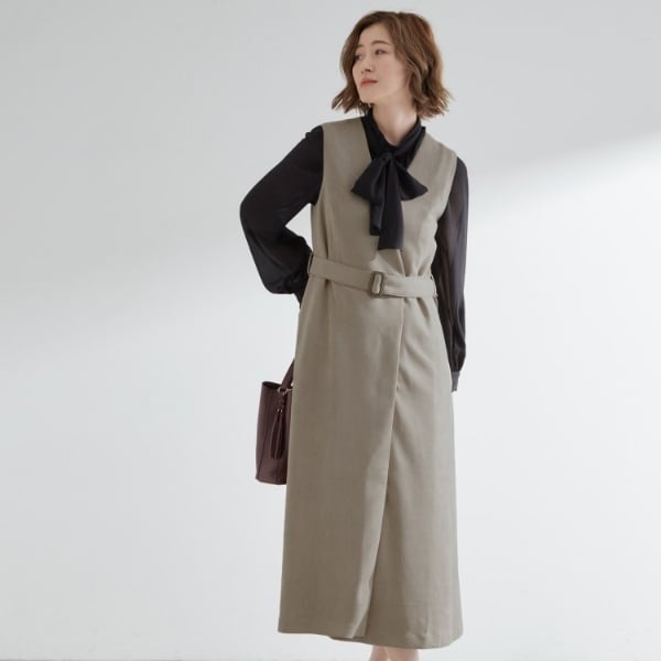 ワンピースとして着用すればきれいめに、ジレとして着用するとカジュアルにアレンジも可能な、ON/OFF活躍する優秀アイテムです。着こなし次第で秋から冬まで長く使えるアイテムです。