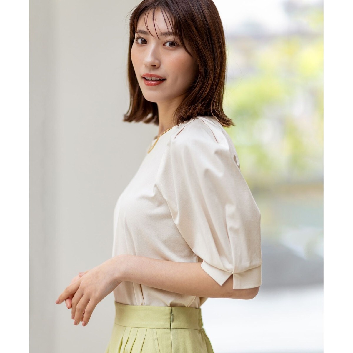 ・程よいボリュームの立体的な袖デザインで着映える・さりげなく二の腕を覆い、お洒落に体型カバー・カットソーの着心地の良さはそのままに、ブラウスのようなきちんと感をプラス・肘の稼動を邪魔しない袖口カフススリット・シャツテールデザインでインでもアウトでも決まる