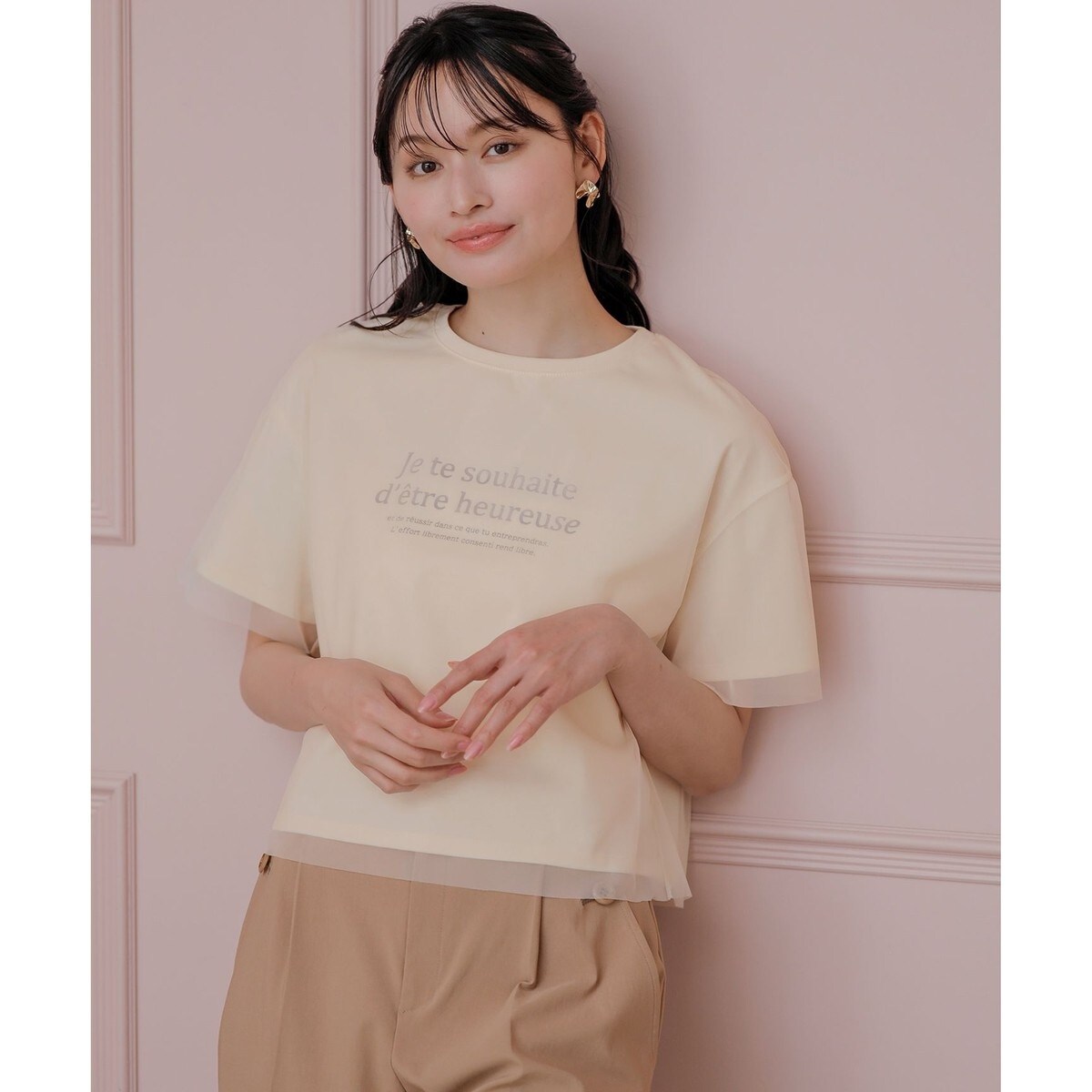 ・天竺+チュールの2重仕立て(チュールの袖口と裾は断ち切り)・フロントロゴ入り「幸せと、全てがうまくいくよう願ってます。好きなようにする努力は人を幸せにする」