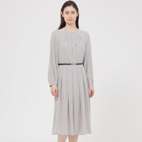 襟元はバンドカラーですっきりとさせ、ウエスト切り替えで裾に向かって程良く広がるエレガントなワンピースです。