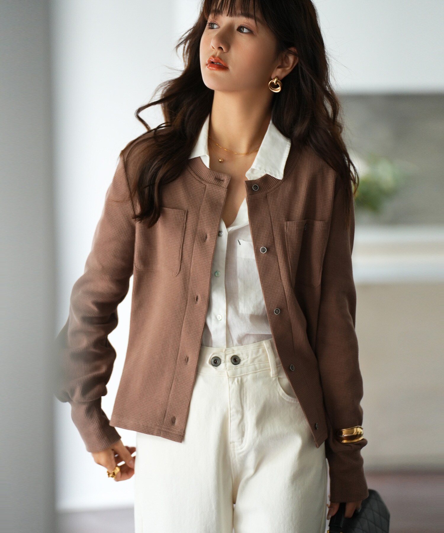 カーディガン クルーネック ノーカラージャケット ベージュ Lサイズ セゾンドパピヨン 長袖