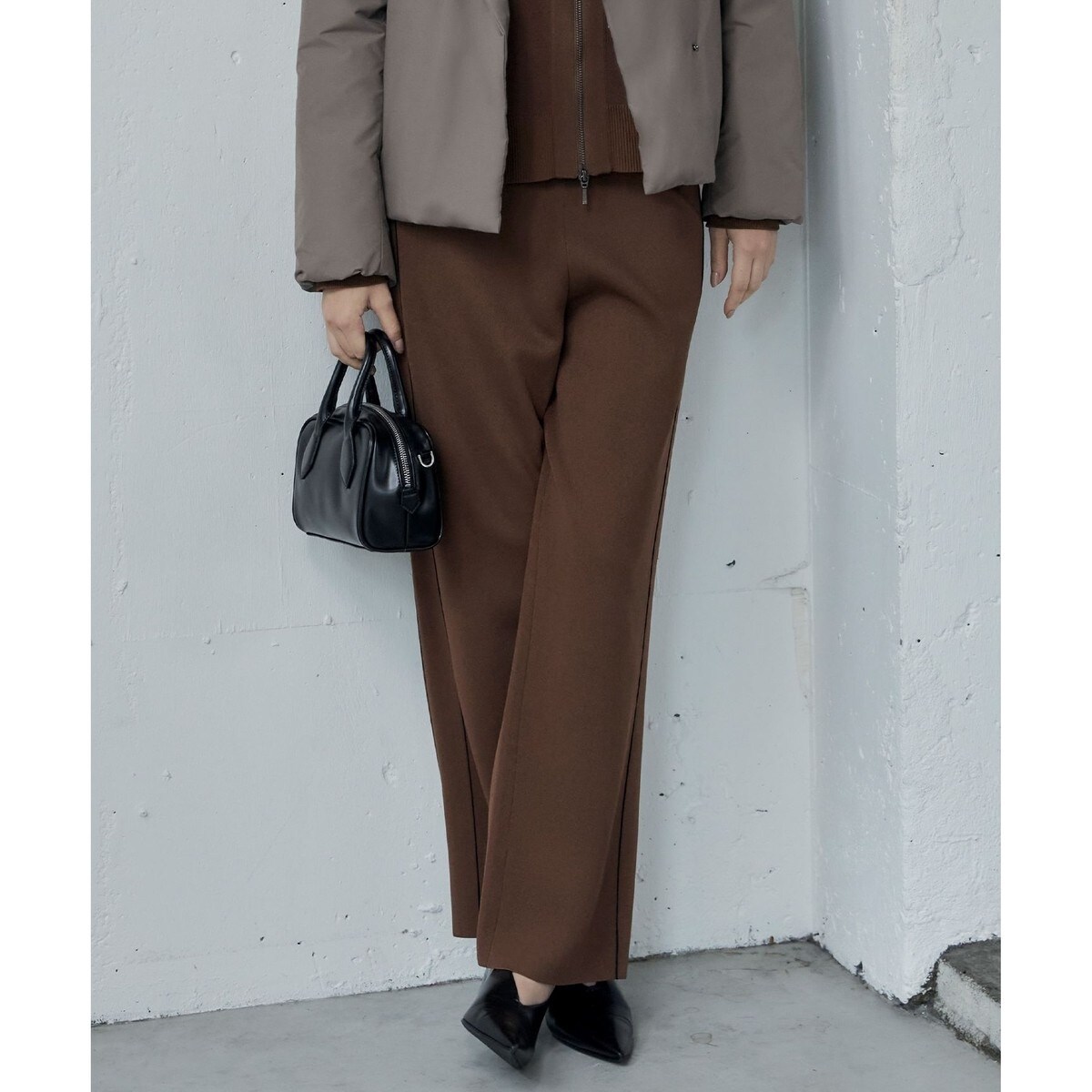 ■デザイン大人が着るトラックパンツをコンセプトに、細めの配色ラインを効かせたニットパンツです。ジャガードのニット地に仕立てることでジャージーのような表面の質感と、シルエット映えを両立し360度どこから見ても綺麗なシルエットに拘りました。ウエストはゴム仕様なので、レングスを調節することも可能です。