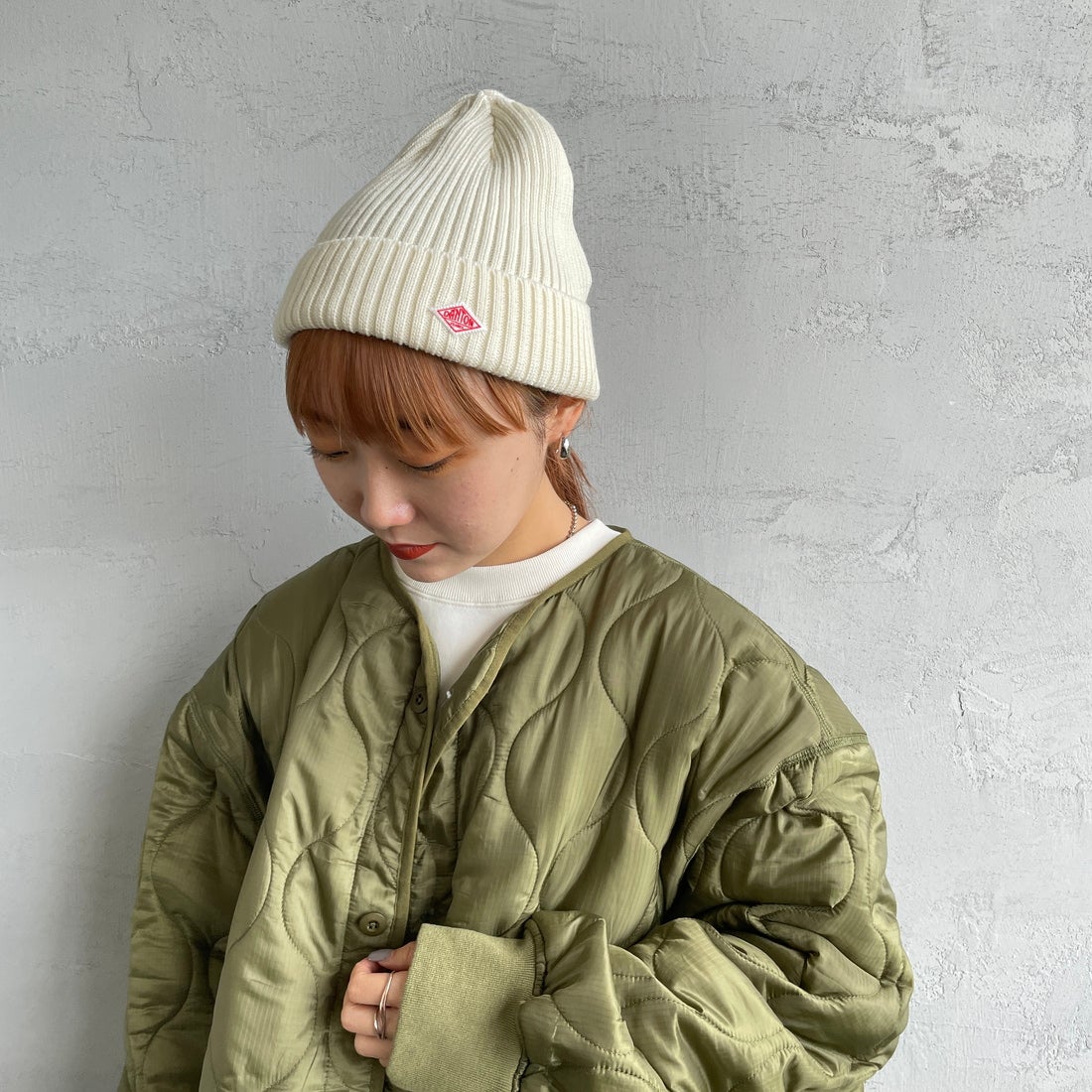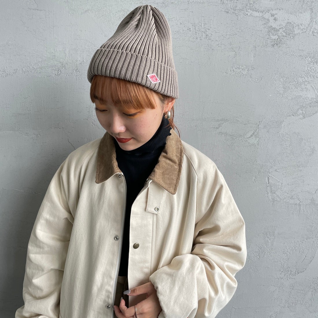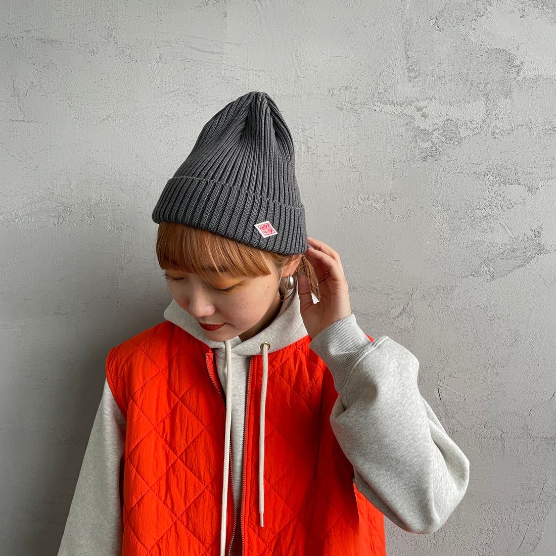 DANTON[ダントン]のリブニットキャップ。ウール100%。シンプルなデザインのボディに、ブランドロゴのワッペンがアクセントになったアイテムです。