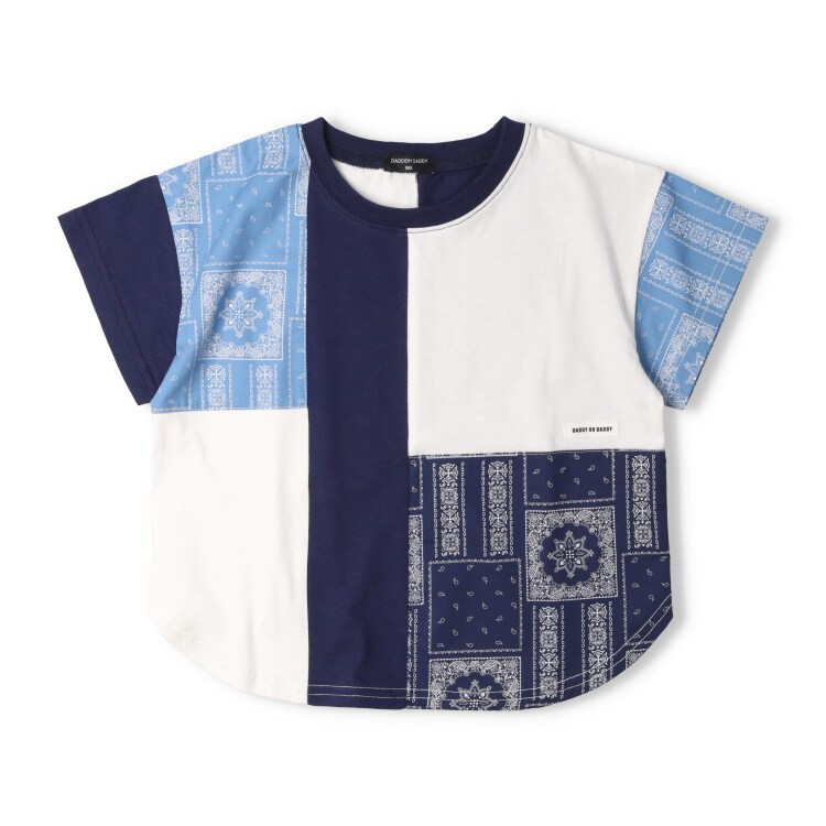 バンダナ柄の切替デザインの半袖Tシャツ。1枚着るだけでインパクトのあるアイテム。男の子も女の子もユニセックスで着られます!同じデザインのスクールサイズ(140150160cm)はV34805になります。【アイテム】トップス カジュアル お洒落 オシャレ かっこいい かわいい 可愛い 普段着 デイリーウェア お出かけ着 お外着 お外遊び着 子ども服 こども服 男児 男の子 ボーイズ キッズ ベビーサイズ トドラーサイズ 幼稚園 保育園 小学校 通園 通学 小学生 2025年春夏物新作 丸高衣料 ネイビー 紺色 ダディオダディ 女児 女の子 ガールズ 男女兼用 コットン100% 綿100%