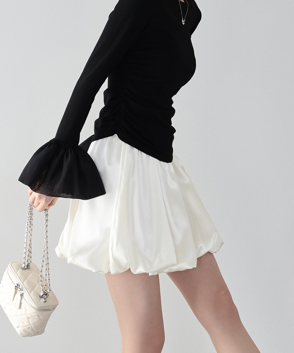 ほんのり光沢、上品な華やかさ。ふんわりサテンのバルーンミニスカート