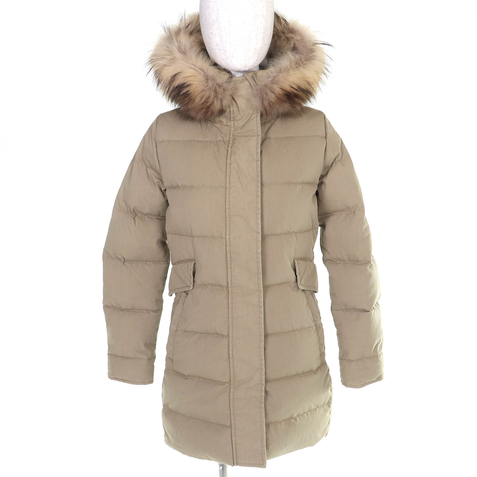 美品★Pyrenex ピレネックス BORDEAUX ラクーンファー・フード・ロゴワッペン付 比翼仕立て ダウンコート カーキ 38 ブルガリア製 正規品 レディース【中古】