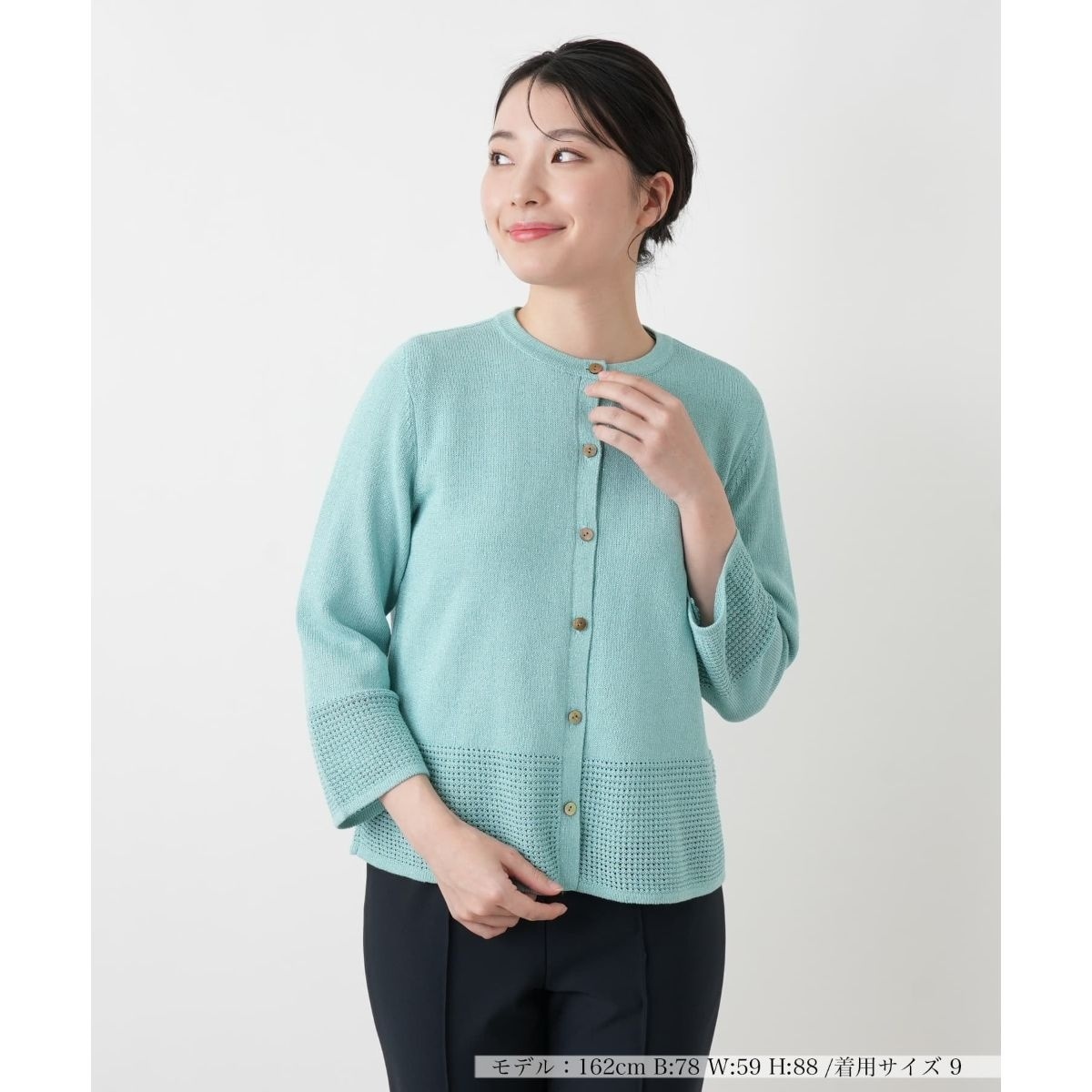 繊細な煌めきを放つ、ラメ糸を編み込んだカーディガン。裾や袖口に施された透かし編みの切り替えが、涼やかで軽快なニュアンスを演出します。フロントにあしらわれた貝調のボタンが上品なアクセントとなり、洗練された大人の女性らしい表情を引き立てる一枚。伸縮性に優れた編地が身体のラインを優しく包み込み、ストレスフリーな着心地を叶えます。気軽な羽織りとしてもバランスの取りやすい丈感で、オンオフ問わず幅広いシーンで活躍してくれそうなアイテムです。