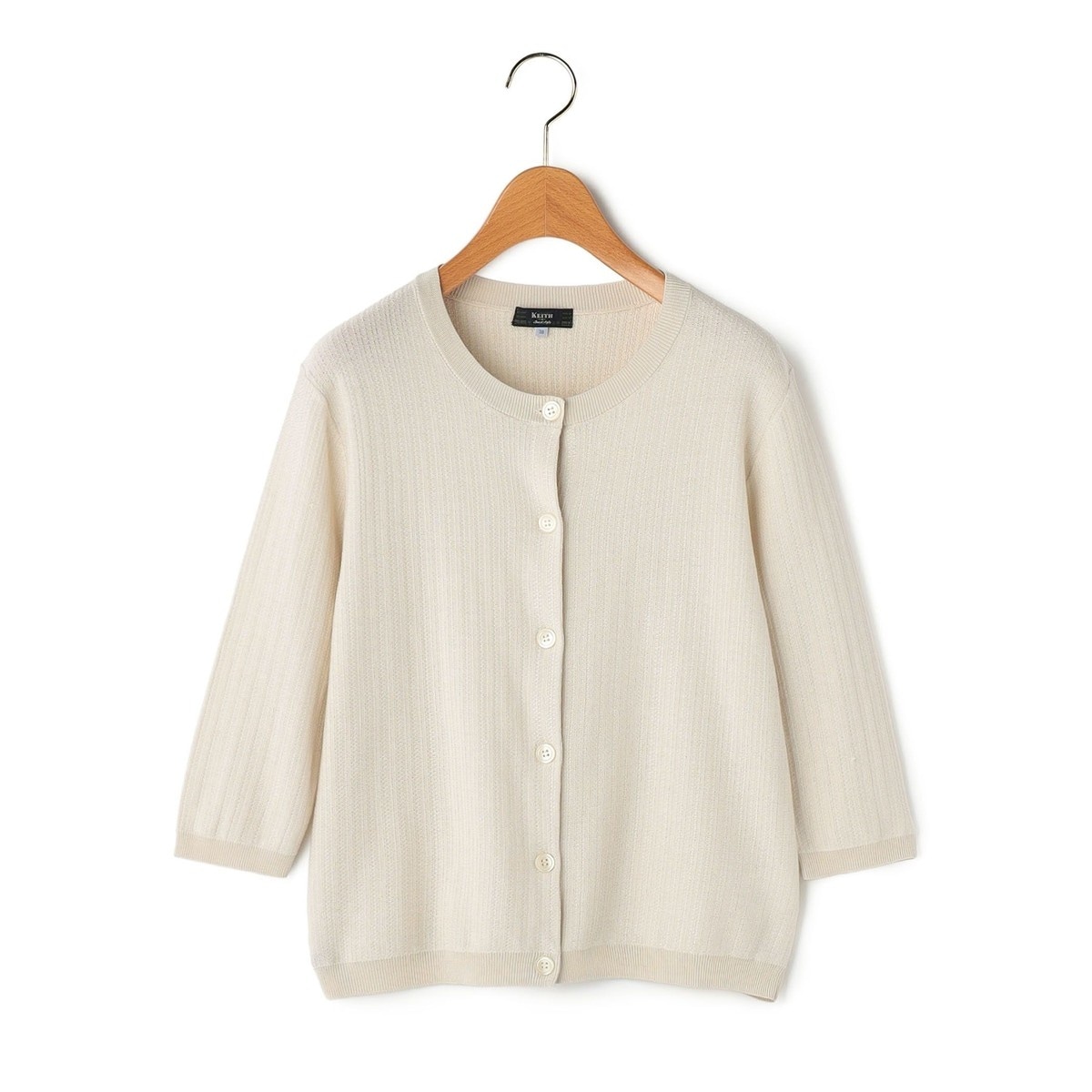 立体感のある模様のスレッド編みがエレガントなデザインの7分袖カーディガン。軽やかなムードの生地感で、春夏シーズンの重ね着コーディネートにぴったり。シンプルなデザインで様々なボトムと好相性。いつもの着こなしにプラスして、オンオフを問わないお出かけスタイルが完成するアイテムです。