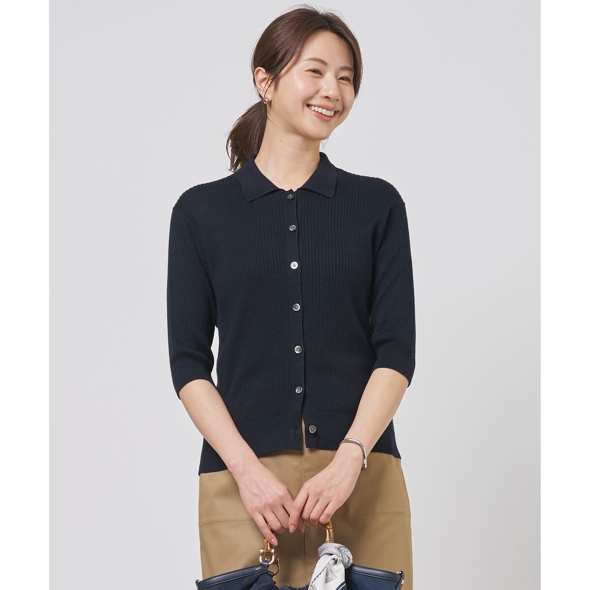 ■デザインリブベースで編み立てた、クラシカルなポロニットカーディガン。縦のラインを強調したリブ編みがすっきりとした印象の1着です。程よいゆとりを持たせたシルエットで、体のラインを拾いすぎないのが嬉しいポイントです。釦を閉じてプルオーバーとして着ればきちんと感のある装いに、前を開けてカーディガンとして羽織ればリラックスした雰囲気に、着回しの効くアイテムです。パンツにもスカートにも合わせやすい丈感で、清涼感あふれる春夏の装いを楽しめます。カラーは、華やかな存在感のあるルビーレッド(#010)、ナチュラルで温かみのあるモカ(#030)、爽やかで知的な印象のサックスブルー(#073)、シーンレスに活躍するネイビー(#075)の4色展開です。