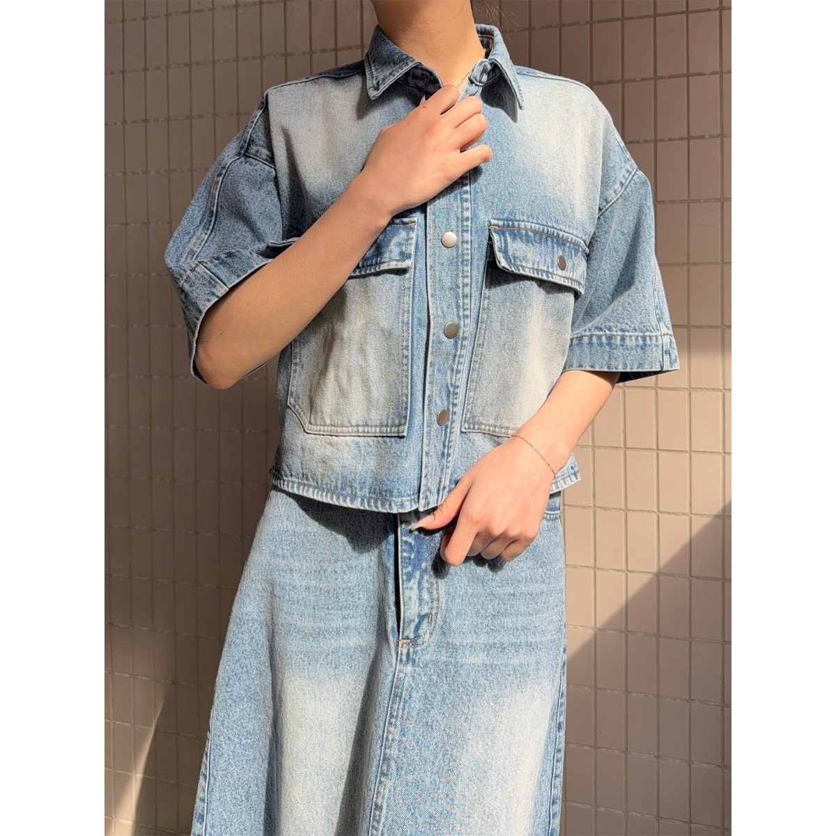 フロントポケットやステッチが程よいアクセントになり、シンプルながらもバランスの取りやすいデニムジャケットです。