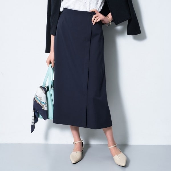 フロントの巻きスカートのようなデザインが、シンプルながらも洗練された大人の表情を作り出します。