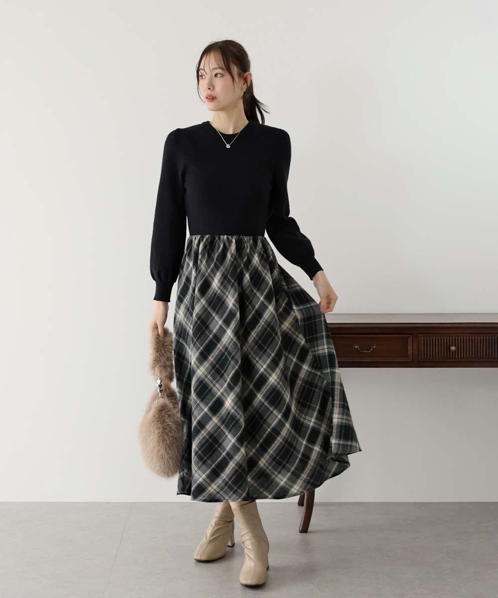 1枚で着映えするボリューム袖ニット×チェック柄スカートのドッキングワンピース。