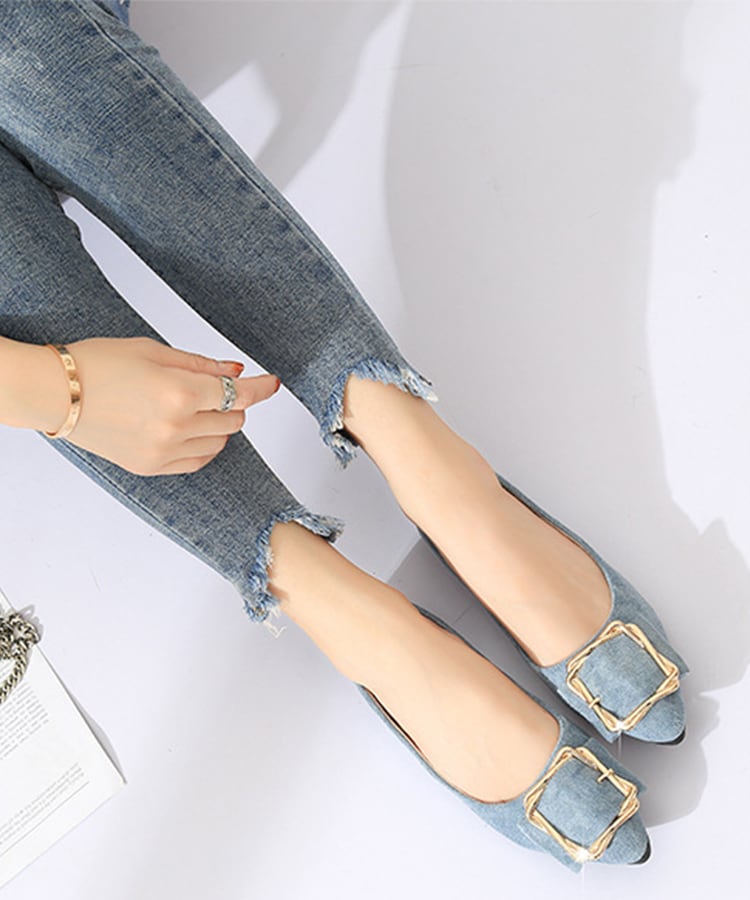 シャープすぎないポインテッドトゥで、フラットでも女性らしい印象に。