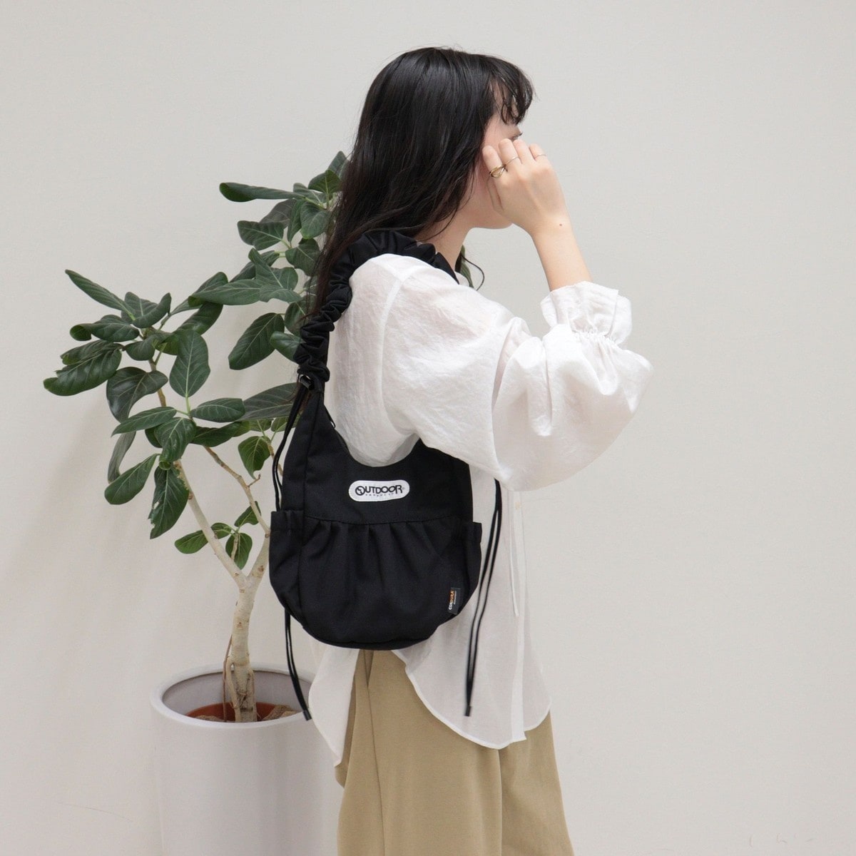 ・丸みのある立体フォルムとギャザーデザインがスタイリングのポイントに
