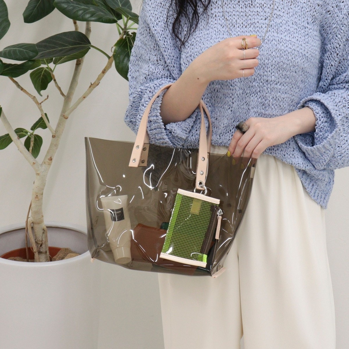 涼しげに持てるレザーハンドルクリアトート