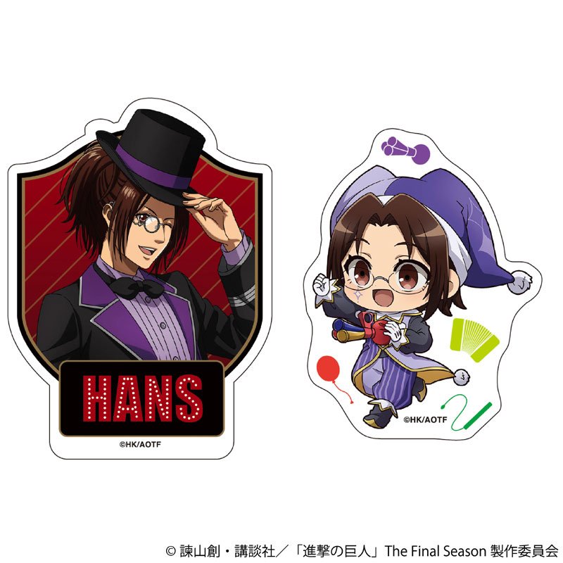 TVアニメ『進撃の巨人』より、煌びやかなマジシャンと可愛いピエロの衣装に身を包んだキャラクターがセットになったステッカーセットが登壇! 用途に合わせて選べる嬉しい2枚セットです。