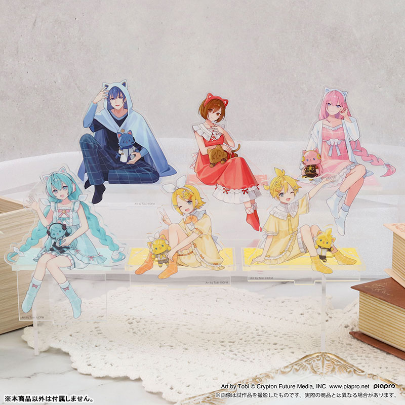 ルームウェアを着てwithCATと一緒にくつろいでいる姿の描き下ろしイラストを使用したアクリルスタンドが登場! 台座と組み合わせることで棚の縁などに座らせることも可能です。 Art by Tobi