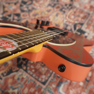リオレウスを表現したオリジナルのカラーリングやピックガードの素材、全てブラックで統一したハードウェアなどにも拘った、唯一無二のギターです。
