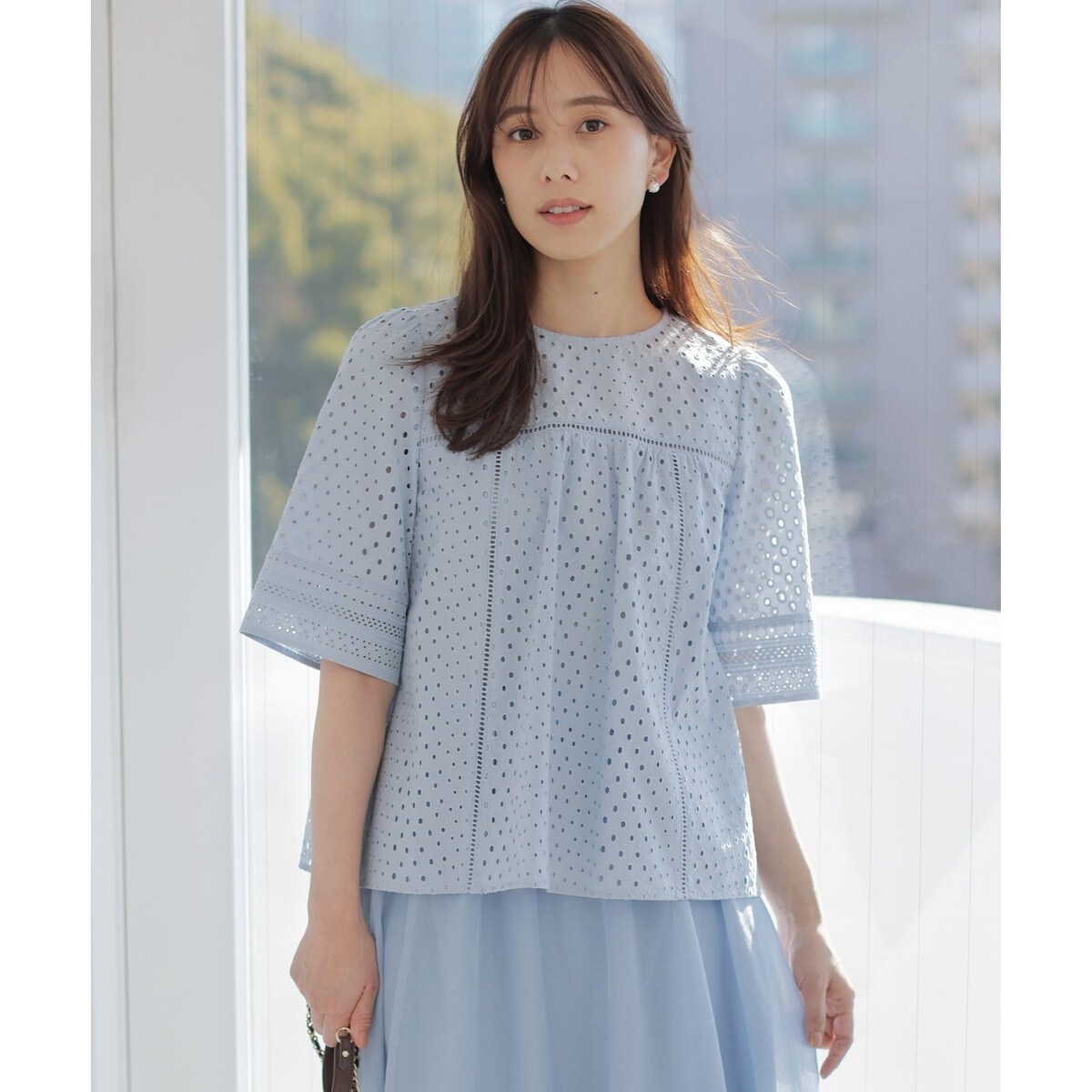 ■デザイン・オリジナルのアイレット刺繍を組み合わせた大人のレースブラウス。・パフスリーブとパネルレースの組み合わせで、特別感のあるデザインに仕上げました。・全体にハシゴレースを使用した切り替えを高めの位置に設定し、スタイルアップ見えを実現しました。・着用時に華やかさが際立つ、立体的なボリューム感にもこだわりました。