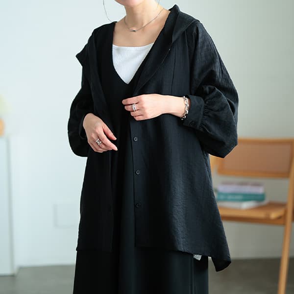 ストライプ柄に織られたドビ―楊柳生地を使用した、軽やかなフーディーシャツチュニック。程よい透け感とサラッとした肌ざわりが心地よく、春~秋までロングシーズン活躍します。スーパーワイドなバスト設定と、裾までストンと落ちるBOXシルエットで、ボディラインを拾わない安心設計◎ドロップショルダー&ボリューム袖が二の腕をさりげなくカバーし、ルーズなのに大人っぽい印象に仕上げます♪