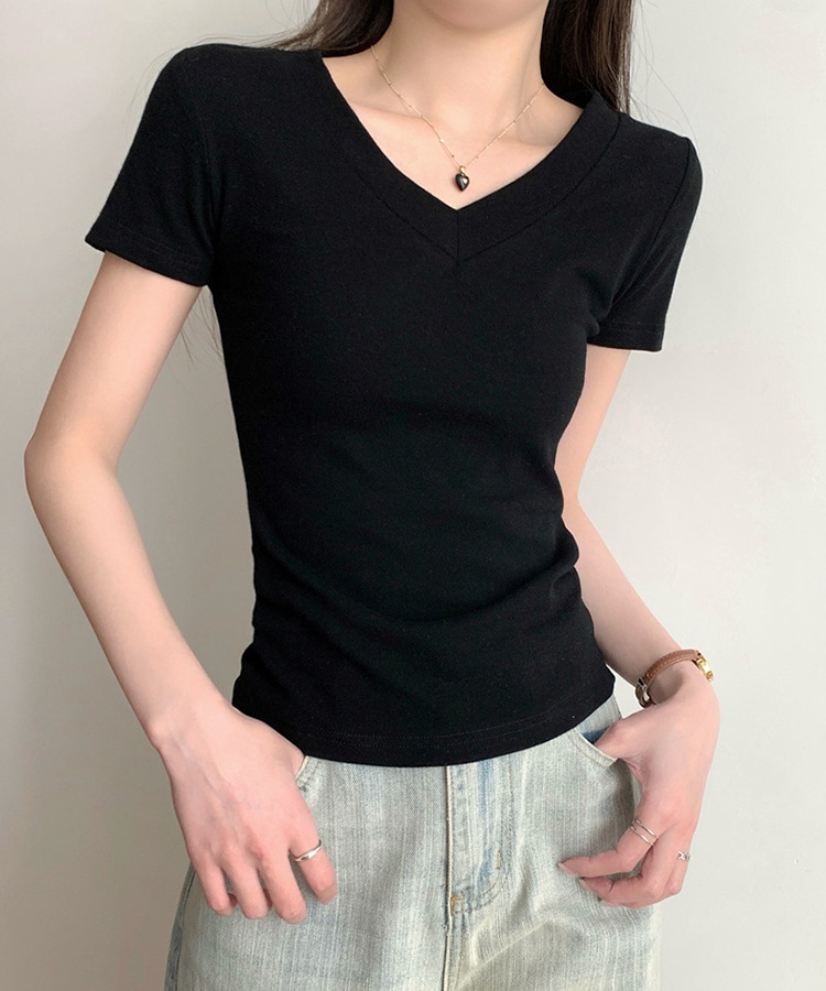 シンプルで着まわしやすい無地のVネックTシャツ。