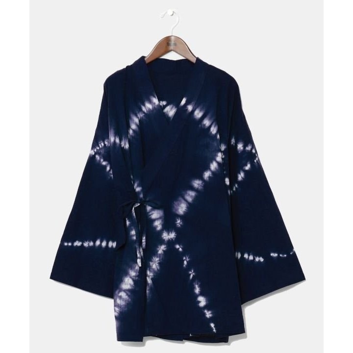夏祭りをテーマにしたシリーズの甚平型羽織り。生地は浴衣の布を模した綿素材を使用し、三種類の絞り染め柄で日本の夏の雰囲気を引き出しています。 ユニセックスで着用可能でき、同じシリーズのパンツとセットで着るとより和の装いを楽しめます。サイドポケット付き。UVカット加工が施されているので、強い日差しでも安心です。