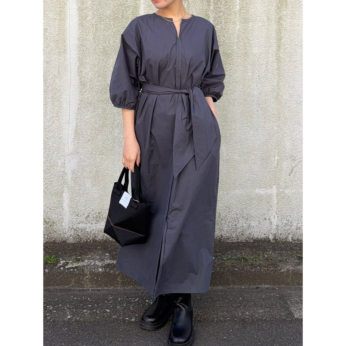 フロントはすっきりとしたミニマルなデザインに、ウエストの共布ベルトがアクセント。