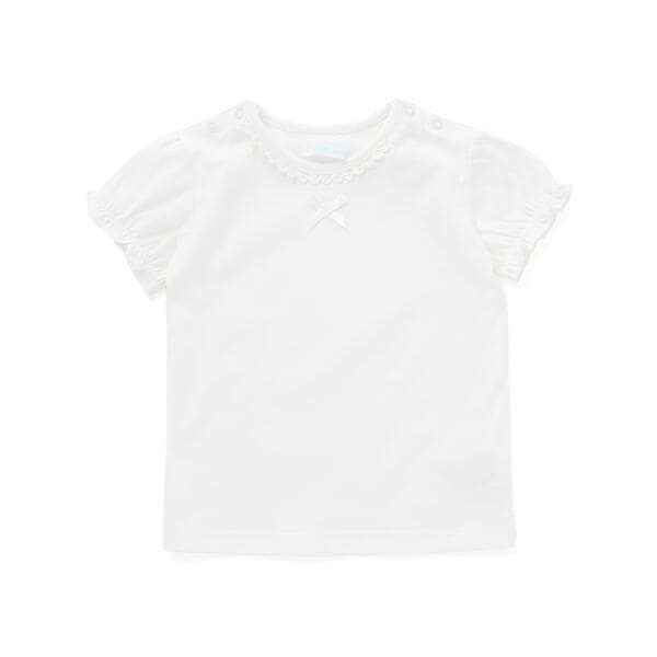 首ぐりをレースで縁取ったふんわりふくらんだパフスリープが可愛い天竺の女の子用半袖Tシャツです。