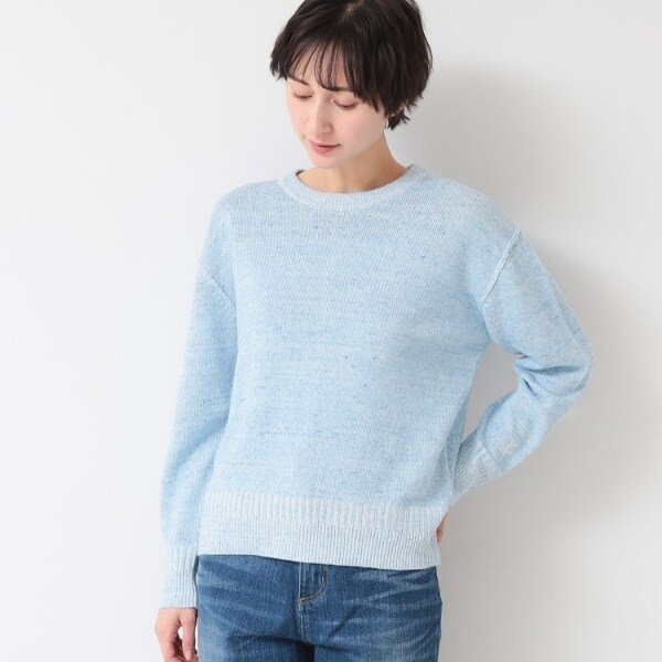 定番素材の杢リネンの裏側に白のコットン糸をプレーティングした編地を利用したニット。