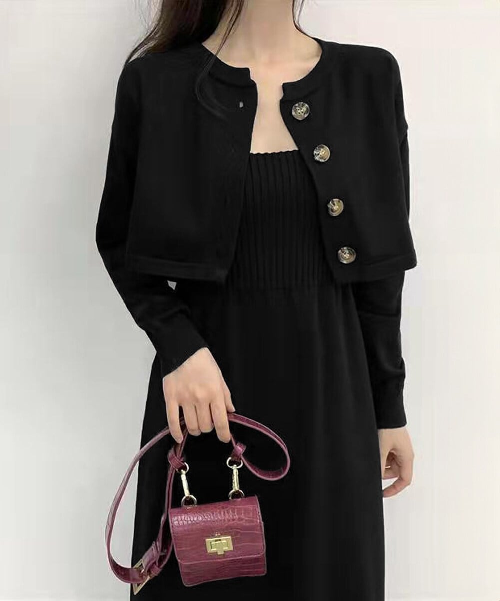 ショート丈カーディガンとリブニットワンピースの2点セットで、着回し力抜群。