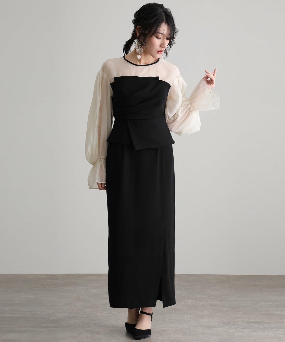 ドレープが加わったビスチェ部分が、個性的でメリハリのあるシルエットを実現。