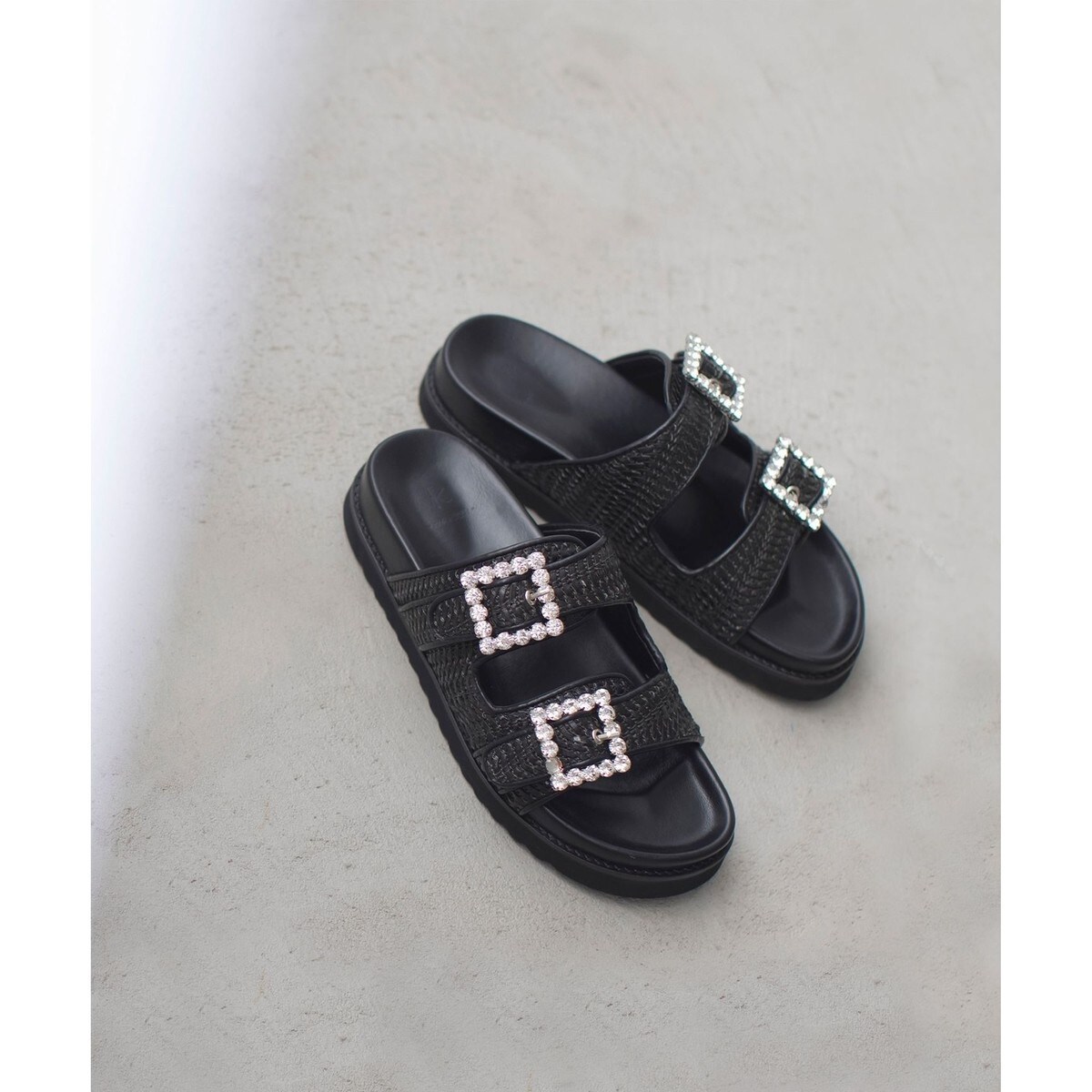 ・大きなビジューのバックルがデザインポイント。・比較的軽いプラットフォームのソール。・足の形状に合わせたフットベッドを使用しており歩きやすいです。