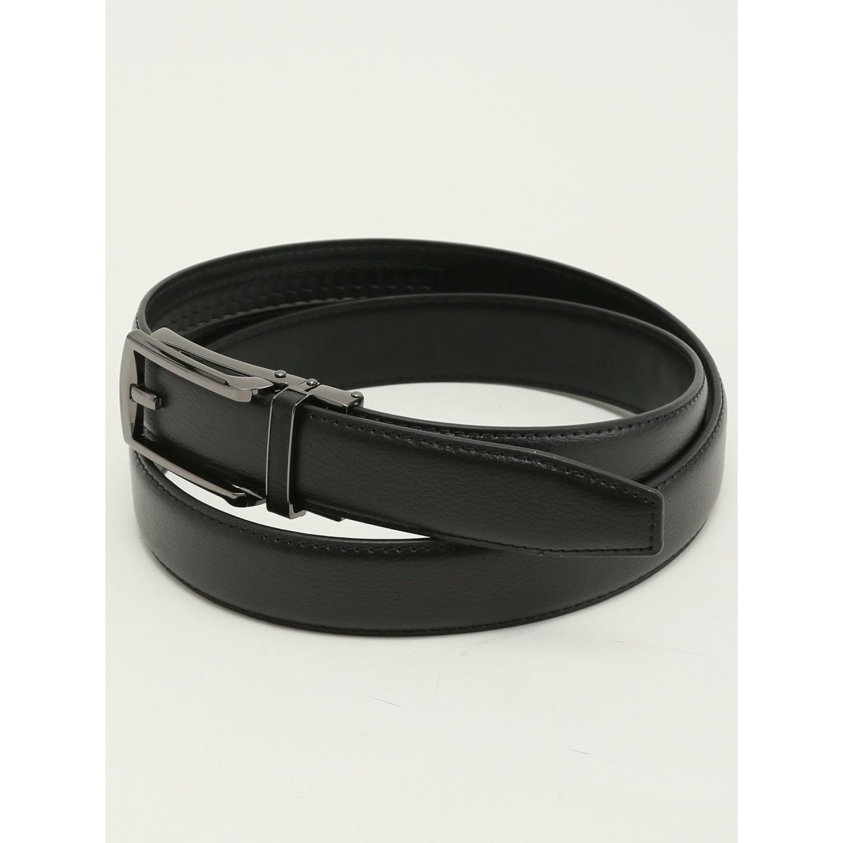 表側はシボ加工をほどこした、細かいシワ模様のある牛革レザー、裏側は合成皮革です。スクエアバックルでスタイリッシュに仕上げています。シックな大人の男の装いを引き立ててくれる上質感が魅力です。