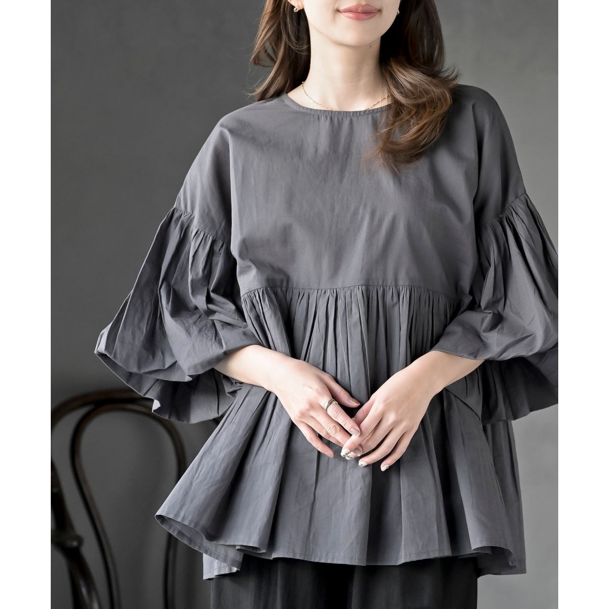 ボリュームたっぷりのバルーンスリーブが女性らしい装いを演出。