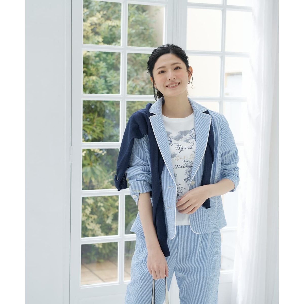 清涼感あふれるシアサッカー素材に、白いパイピングが爽やかな印象のジャケット。