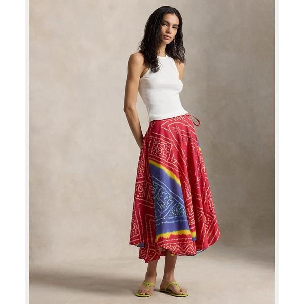 正統派のラップシルエットが際立つ、美しいコットン製ドレープスカート。鮮やかな絞り染め風モチーフのプリント入り。ウエストで結ぶデザインと、歩くたびに流れるような動きが生まれる斜めのカスケードの裾が特徴・Aラインのシルエット / ふくらはぎ丈・ウエスト背面にベルトループ / 左ウエストのセルフタイで留めるラップシルエット・右ウエストの内側にボタン留め・サイドシームポケット・裏地なし・モデル身長178cm、着用サイズ4※注意:柄の配置は、商品によって異なります。 【素材】・本体:綿 100%【生産国】インド