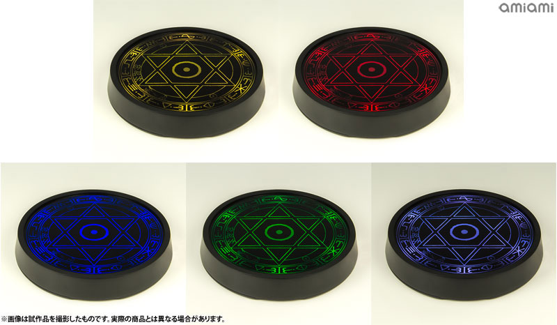 ■魔法陣台座:大滝進矢氏(スーパーグランゾート役)の台詞とSEをTV放送当時と同じ音響スタッフ協力の下新規収録!台詞・SEと連動して魔法陣が全5色に発光!またスタンドパーツを使用すると、平置きだけでなく立てた状態でディスプレイが可能。作中の召喚イメージを再現することができます。