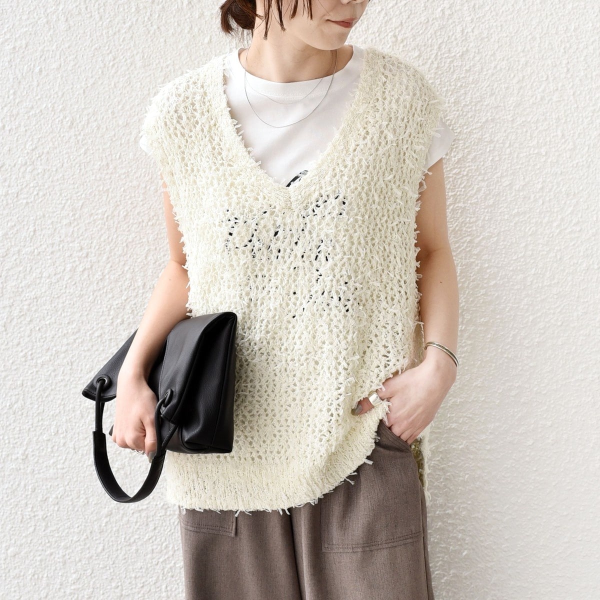 凹凸感のある編地がスタイリングのアクセントになるサマーニット。