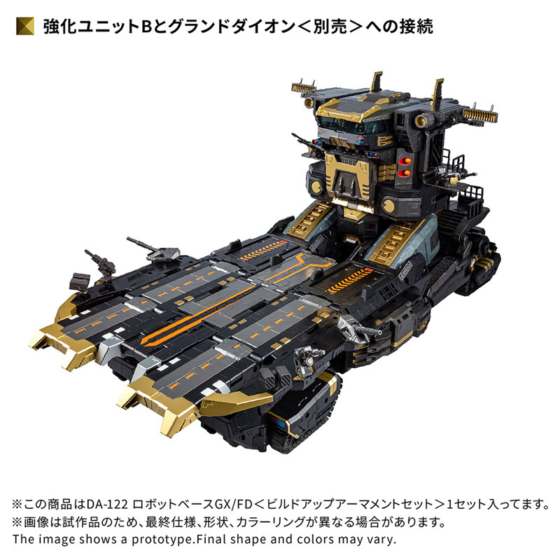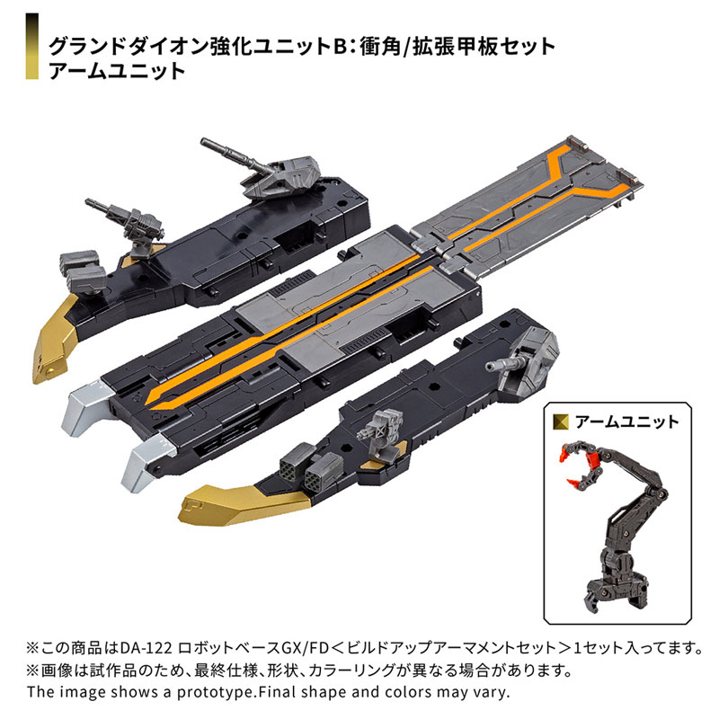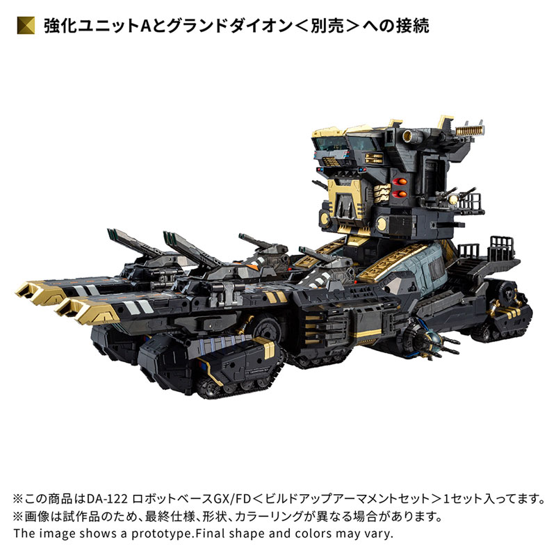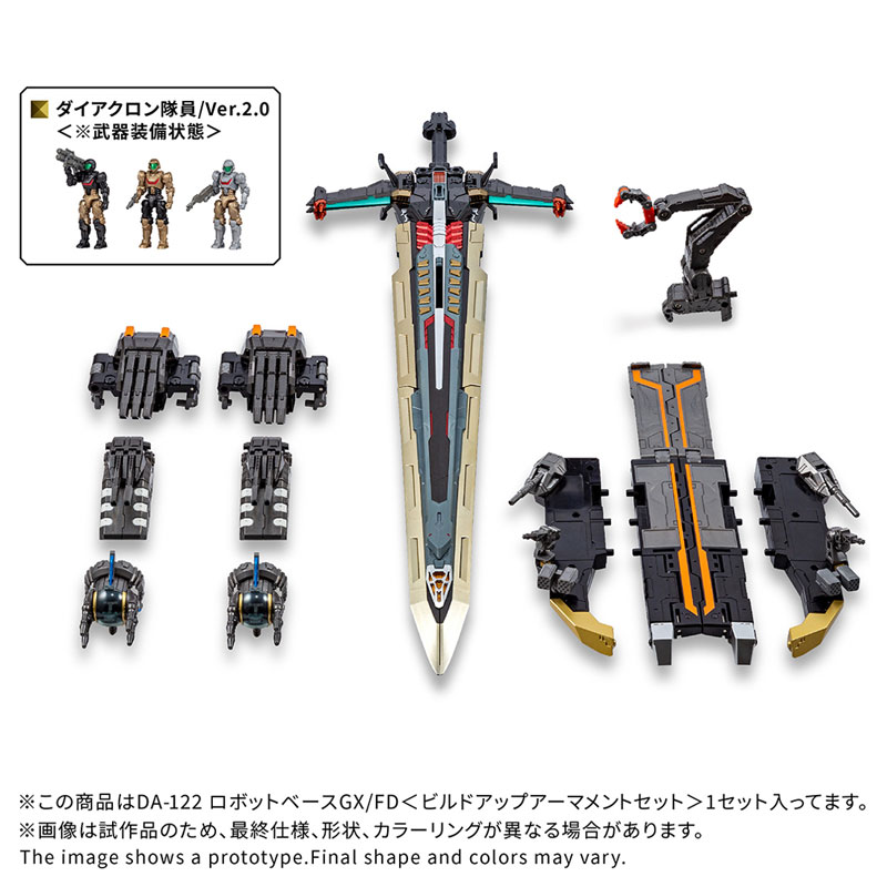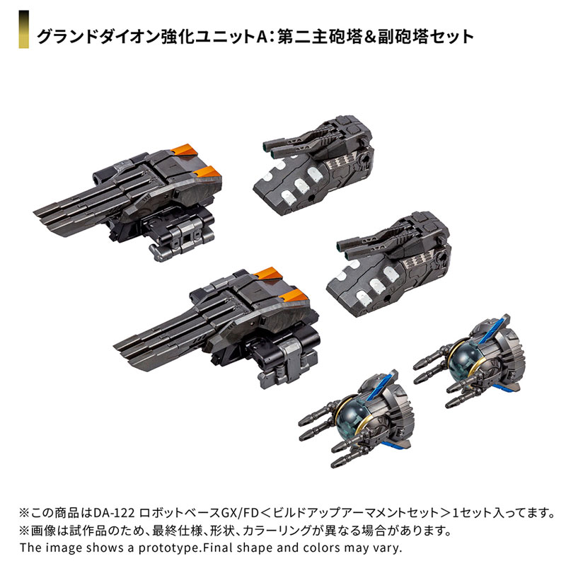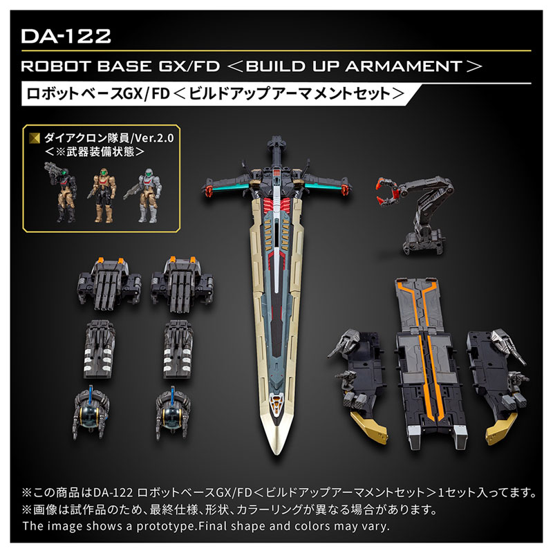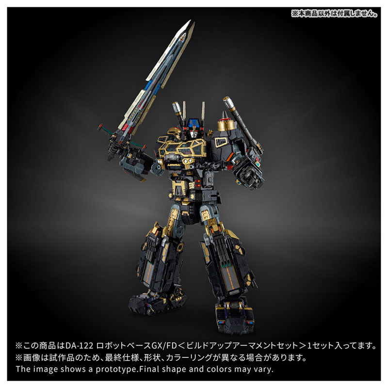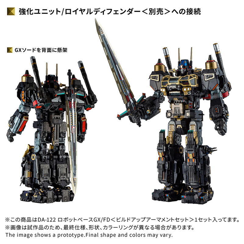 「DA-120 ロボットベースGX〈ロイヤルディフェンダー〉」(別売)を強化するための超弩級戦闘兵器・GXソード、戦艦的・航空母艦的機能をより強化するユニット群がセットになって、特別カラーで登場!