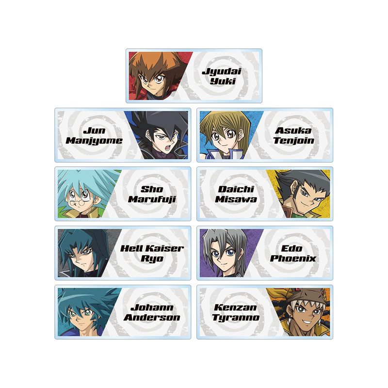 遊城十代、万丈目準、天上院明日香、丸藤翔、三沢大地、ヘルカイザー亮、エド・フェニックス、ヨハン・アンデルセン、ティラノ剣山のイラストをアクリルネームプレートに仕上げました。