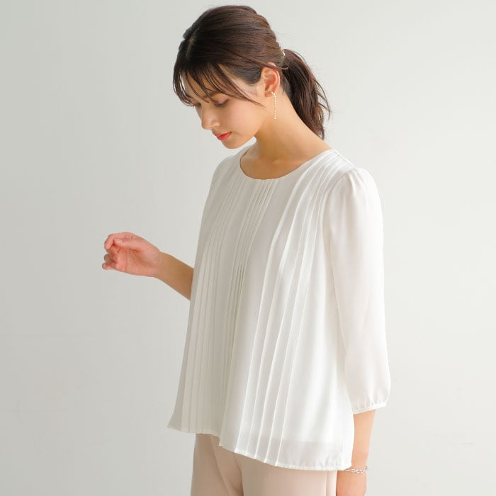 プリーツデザイン×シフォン素材がとびきりフェミニンなブラウスが登場!スッキリとした落ち感キレイめシルエットで、カジュアルにもオフィススタイルにも使えそうなきちんと感が◎色んなコーデに合わせて可愛く上品に着こなして。