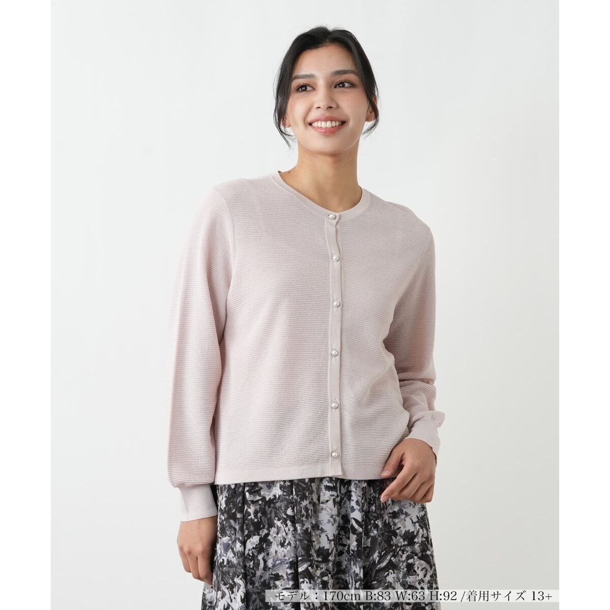 全体に施された繊細な編み地が、装いに上品な表情と豊かな質感を与え、首元はすっきりと開いたクルーネックデザインが顔まわりに優しい印象をもたらします。フロントに並んだパール調のボタンは、控えめながらも華やかなアクセントとなり、着こなしを上品に引き立てます。袖口と裾には丁寧なリブ編みが施されており、全体のシルエットを美しく整えながら、心地よいフィット感を実現しています。やや短めの丈感とコンパクトなシルエットは、様々なボトムスとバランス良く合わせやすく、幅広いスタイリングをお楽しみいただけます。