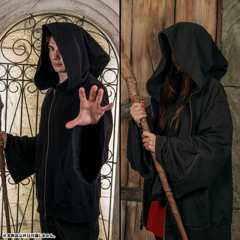 ・魔術師のような大型のフードはスナップボタンでボリューム調整可能。