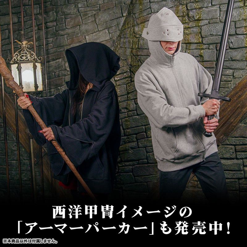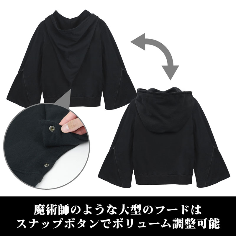 ・魔術師のような大型のフードはスナップボタンでボリューム調整可能。