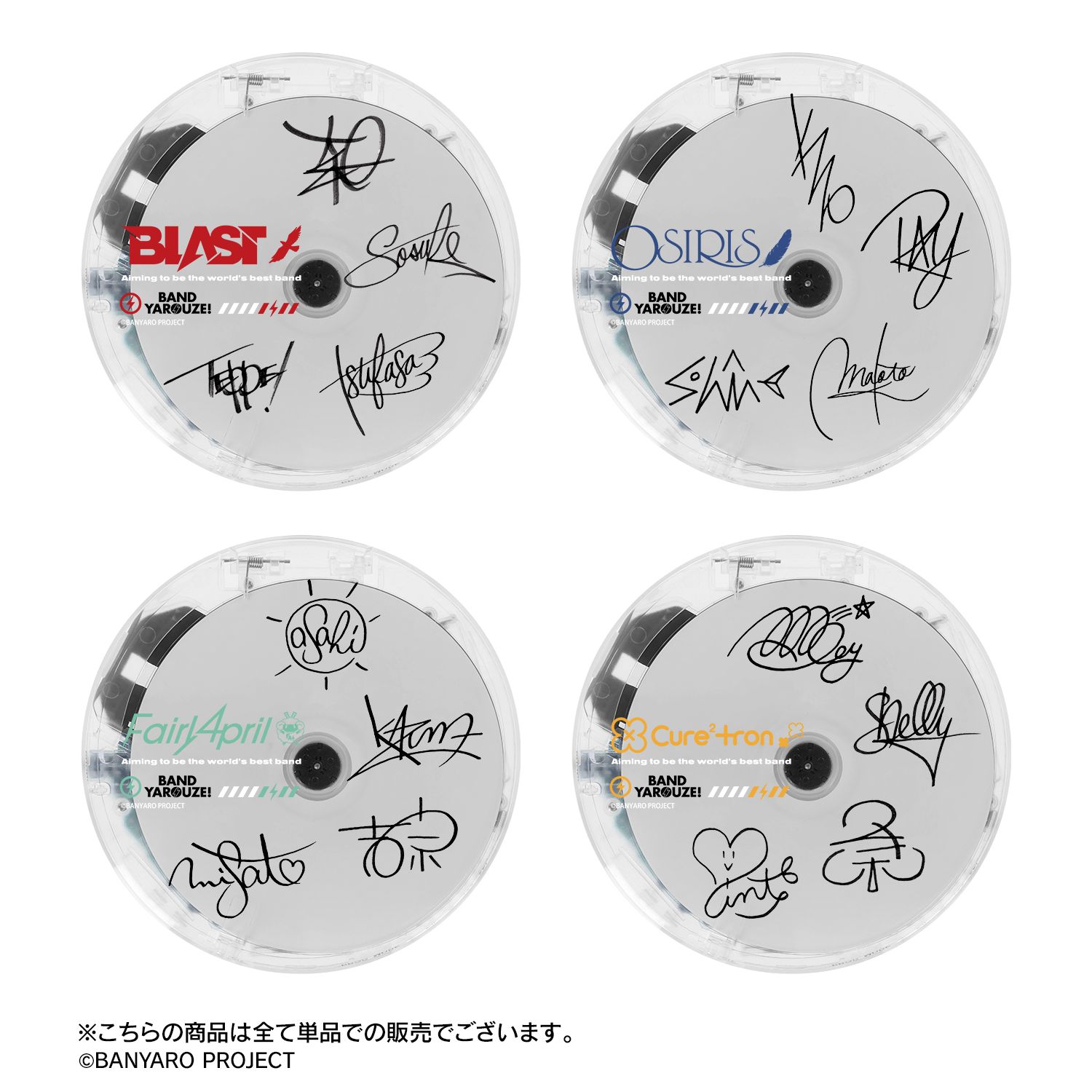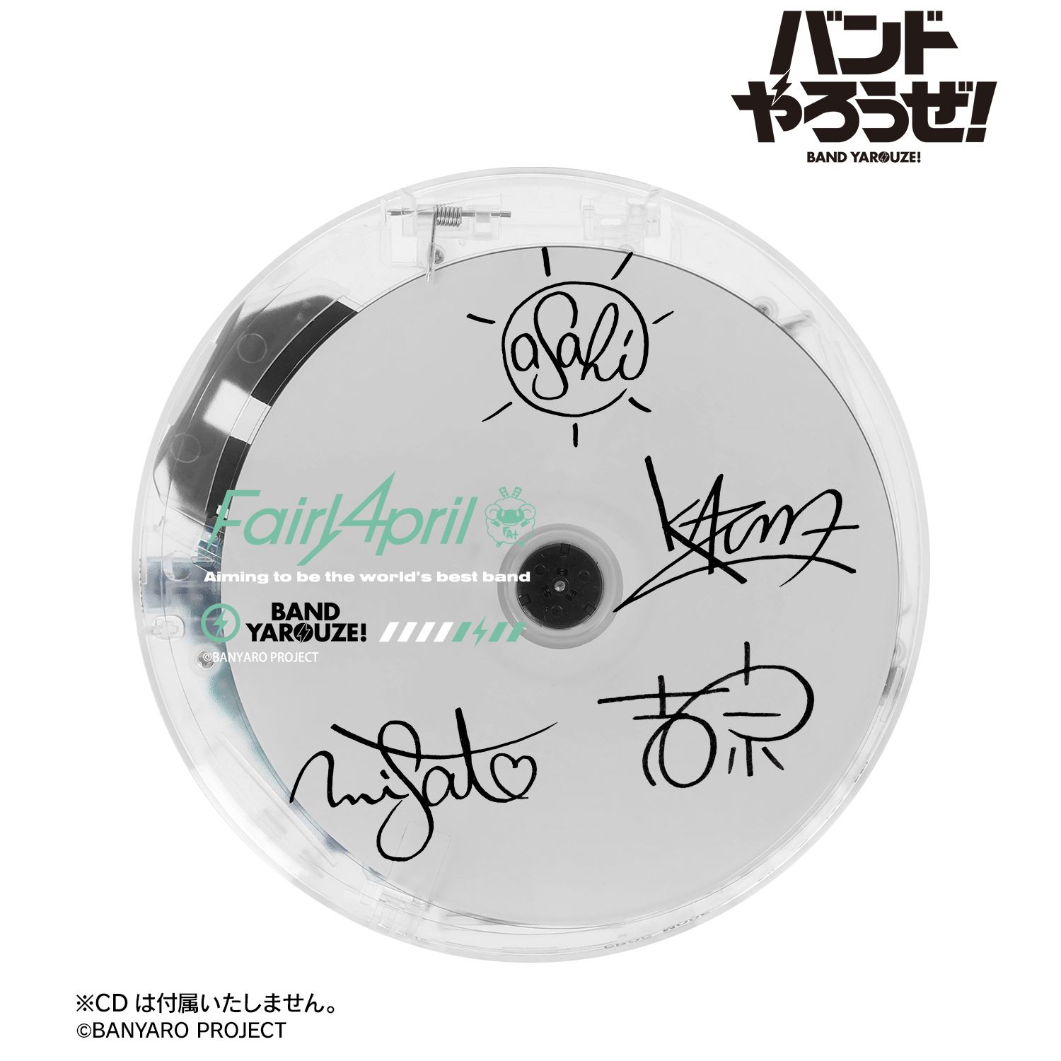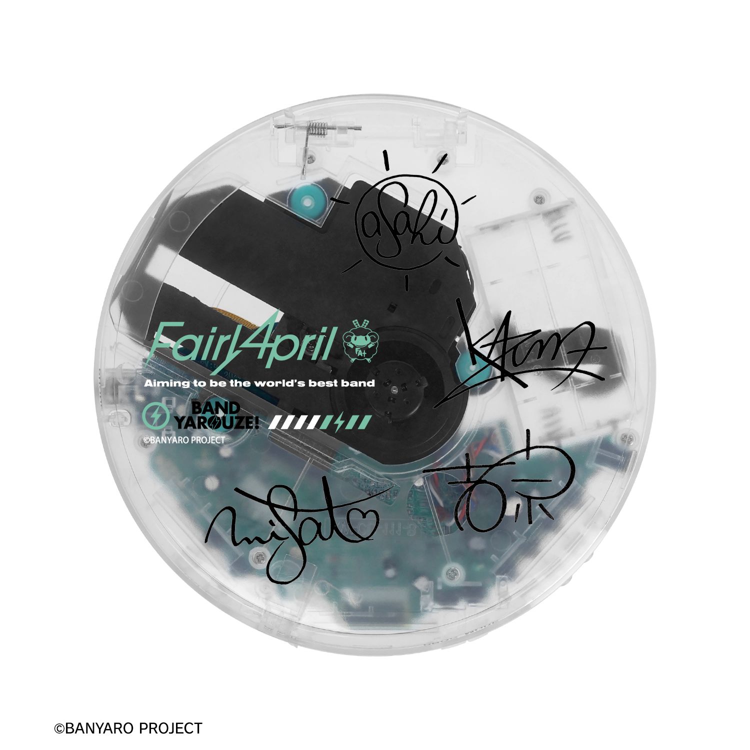 Fairy Aprilのロゴ、作品ロゴ、「目指すものはバンドの頂点」の英字、鳳 葵陽、七瀬一真、徳田吉宗、藤堂美郷のサインをポータブルクリアCDプレーヤーに仕上げました。