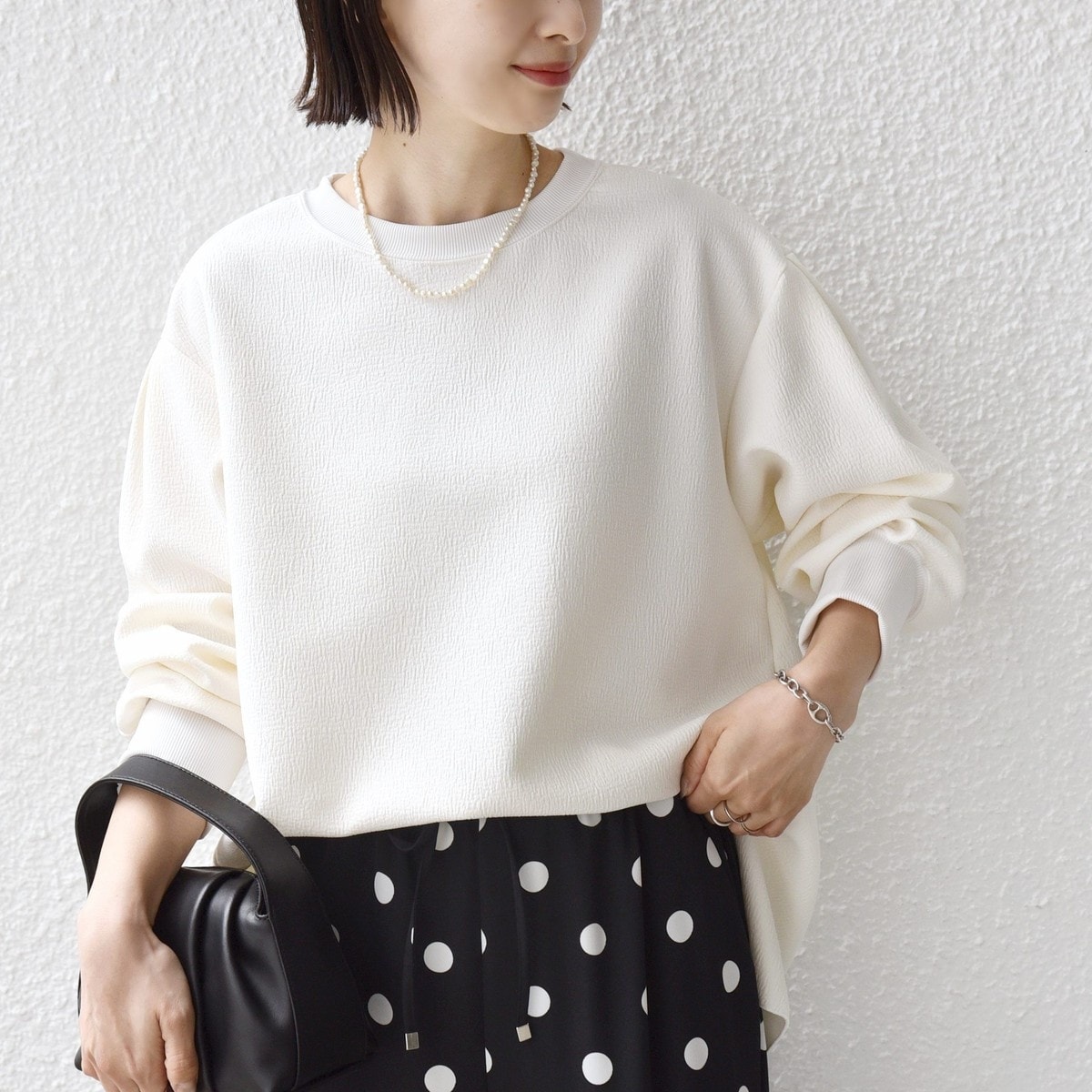 カジュアルすぎない素材の為、きれいめボトムとの合わせでお仕事にも着用可能。