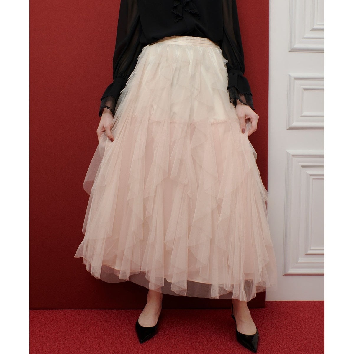 たっぷりとしたラッフルのチュールが華やかさを演出する、コーディネートの主役になるスカートです。