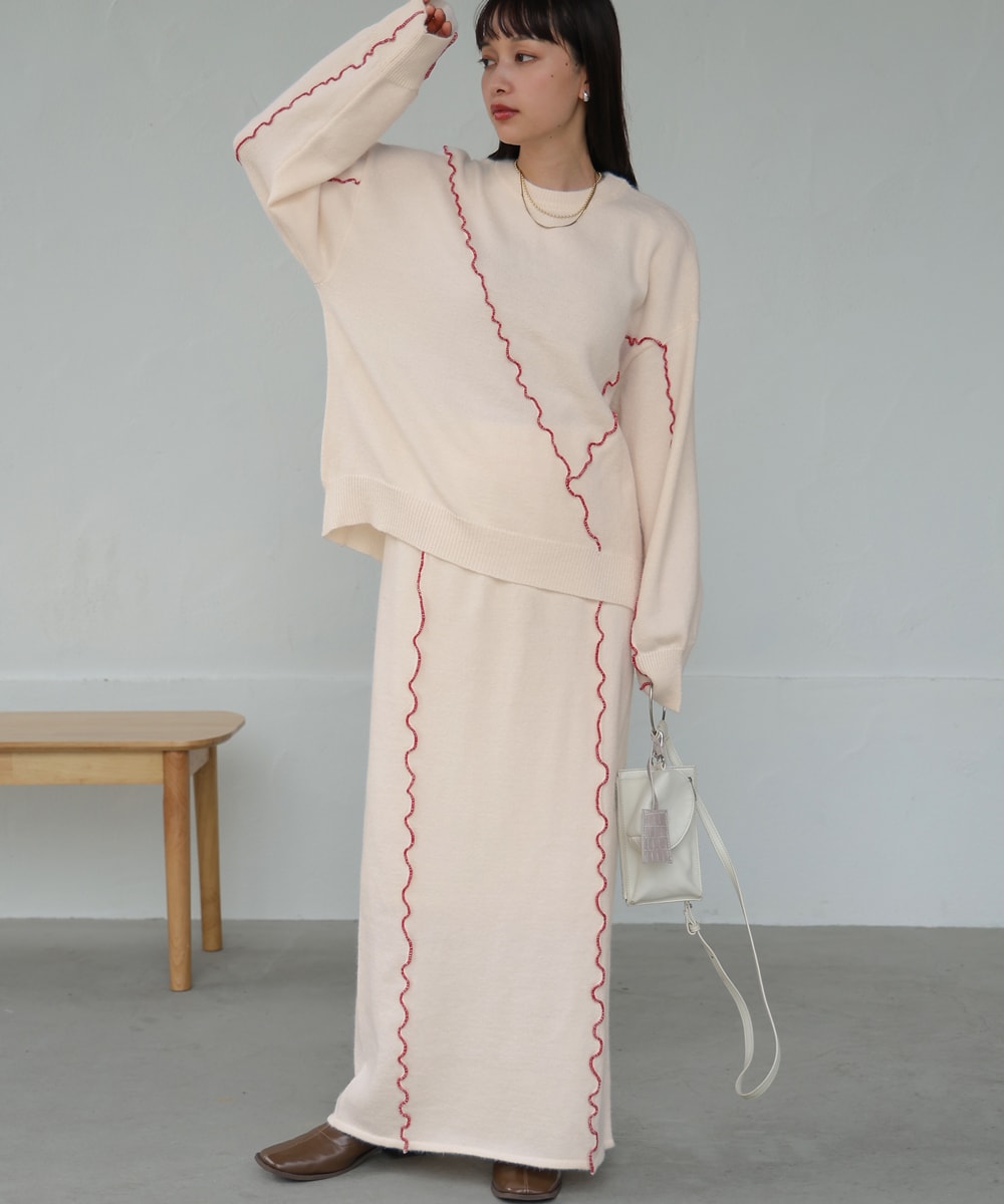 フロントに入ったウェ-ブメロウが縦長ラインを強調し、細見え効果抜群なニットスカート。
